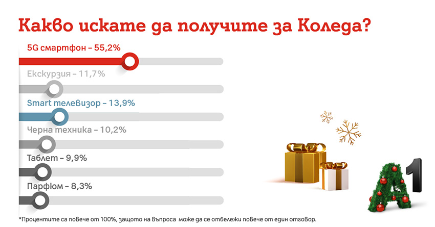 Над половината от българите (55%) биха искали да получат 5G смартфон като подарък за Коледа. Вторият най-желан подарък е смарт телевизор за 13.%, а списъкът се допълва от екскурзия (11.7%), черна техника (10.2%) и таблет 9.9%. Това показват резултатите от непредставително онлайн проучване, направено сред над 2300 посетители на А1.bg в периода 26 ноември - 9 декември.