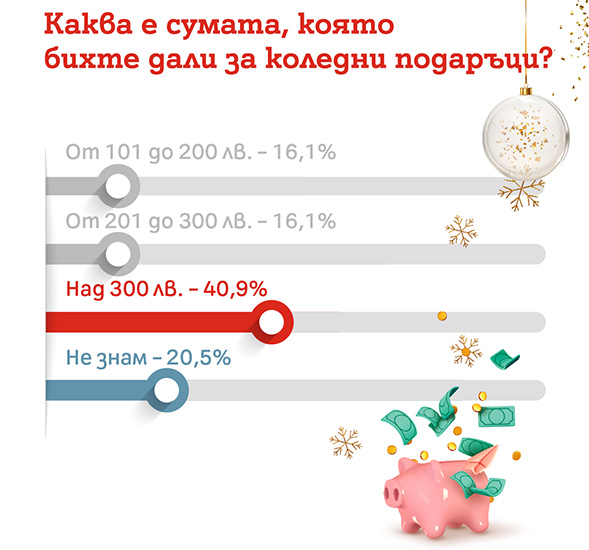 По отношение на стойността на подаръците тази година най-голям процент (40.9) от анкетираните ще отделят над 300 лева, за да зарадват свой близък или себе си. Тези, които ще похарчат между 101 и 200 лева, и между 201 и 300 лева са с равен дял – по 16.1%. Най-щедри ще са жителите на Кюстендил, като 51.8% планират да закупят подаръци за над 300 лева, следвани от тези в София (48.9%), Варна (45%) и Бургас (43%).