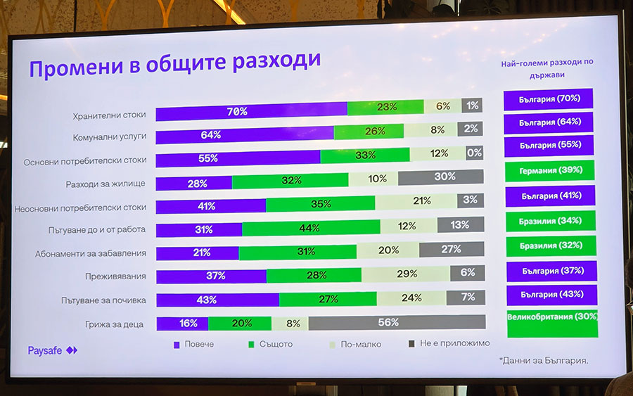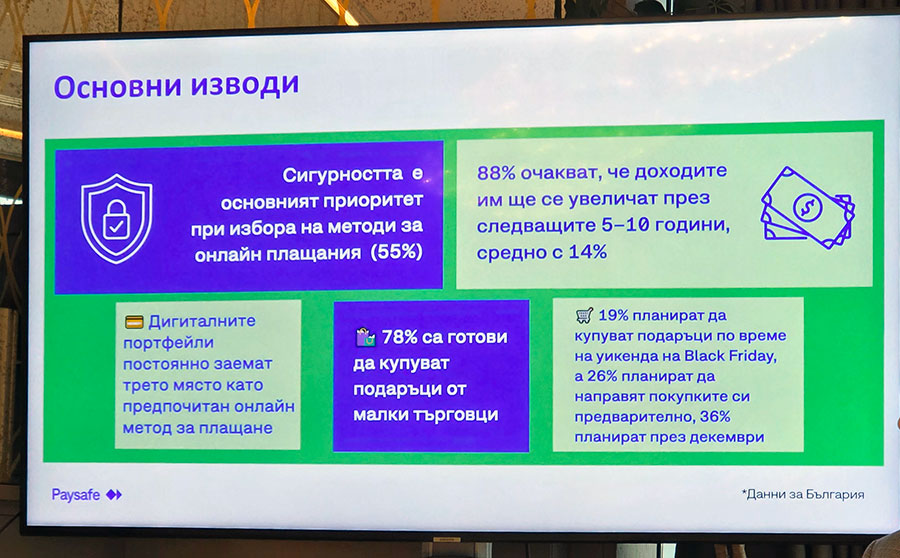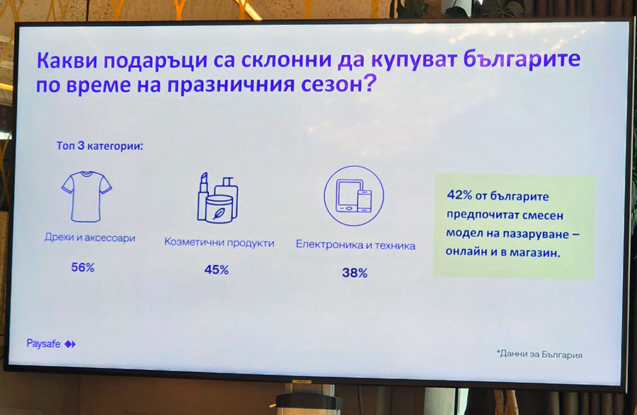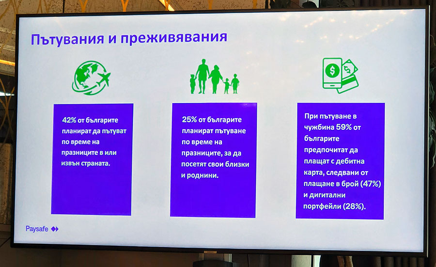 Проучването на Paysafe, проведено сред 8500 потребители в САЩ, Бразилия, Великобритания, Германия, Канада, България и Еквадор, показва силен фокус върху разходи за пътувания по време на празниците. Потребителите са също толкова ангажирани, когато става въпрос за празничните покупки, като интересът им към интегрирана търговия и пазаруването в социалните мрежи нараства, въпреки че и подкрепата им за малките и местните бизнеси остава висока.