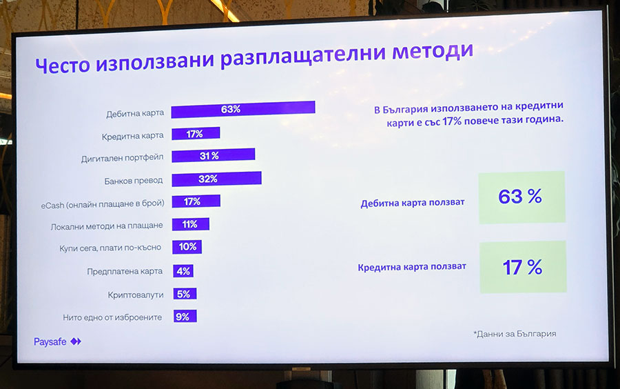 Платежните предпочитания се променят, което изисква гъвкави опции за плащане: въпреки, че дебитните карти са най-популярните методи за плащане, в останалите държави се използват 46%, а в България 59%. Кредитните карти са съответно 37% - глобално и 15% за България, дигиталните портфейли са на трето място с равен процент - 27%. Местните методи за плащане (LPM) и дори плащането в брой остават популярни на някои пазари.