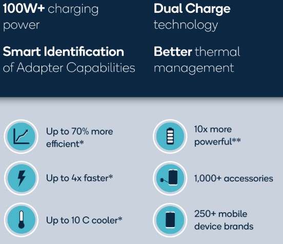 Тя е с до 70% по-ефективна, като работи при 10 градуса по Целзий по-ниска температура на батерията. По данни на Qualcomm с нея ще е възможно зареждането на батерия с капацитет 4500 mAh от 0% до 50% за едва 5 минути, а до 100% – за 15 минути.