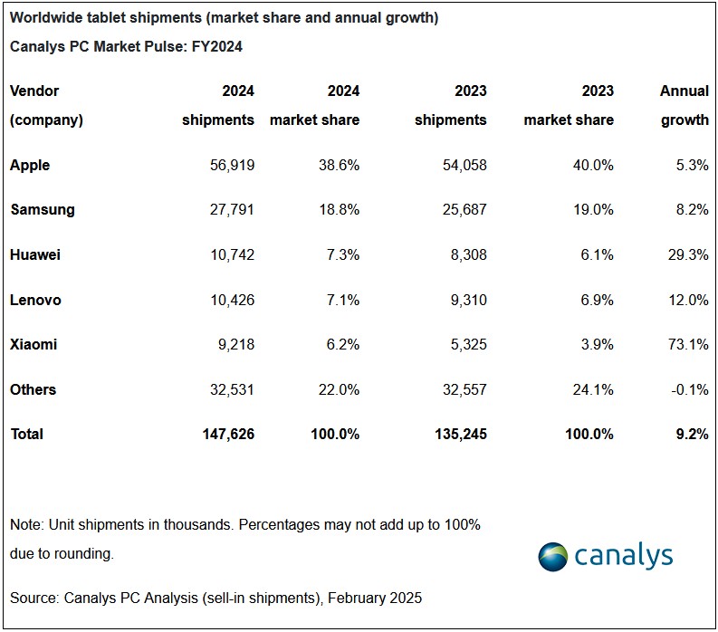 По последни данни на Canalys през четвъртото тримесечие на 2024 доставките на таблети в световен мащаб са нараснали с 5.6% на годишна база, достигайки 39.9 млн. броя. По този начин общите доставки за цялата година достигат 147.6 млн. единици, което е с 9.2% повече в сравнение с 2023.