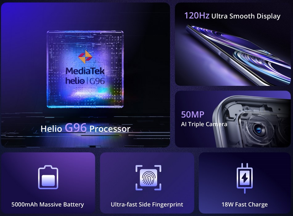 Основната камера включва 50MP сензор, 2MP за макроснимки и 2MP монохромен. Батерията е с капацитет 5000 mAh и се поддържа технология за зареждане до 18 вата. Има още USB Type-C порт и поставен отстрани на корпуса четец на отпечатъци.