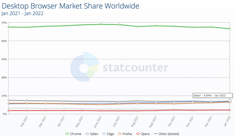Safari държи второто място през януари, но два от конкурентите му са много близо до него. Браузерът на Apple има 9.84%, следван от Microsoft Edge с 9.54% и Firefox с 9.18%. За сравнение Google Chrome има дял от 65.38%. Година по-рано делът на Safari е бил 10.38%, което подсказва, че решението на Apple губи пазарен дял.
