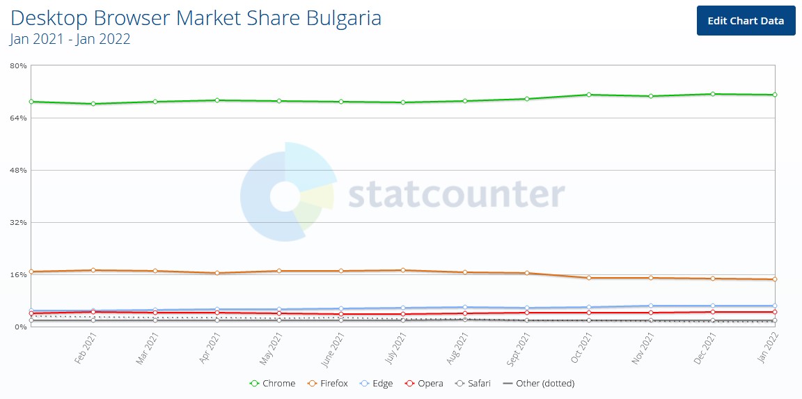 Предстои да видим дали Firefox или Edge ще заеме втората позиция през идните месеци. Каква е ситуацията е България? У нас Chrome също е най-популярен със 70.96% през януари. Второто място е за Firefox (14.53%), следван от Edge (6.49%), Opera (4.47%) и Safari (2.02%).