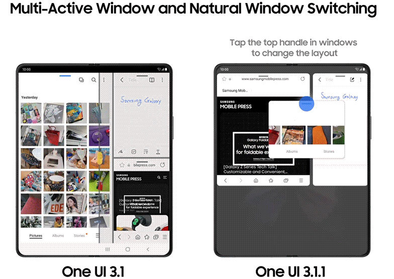 Multi-Active Window позволява едновременното ползване на три приложения чрез разделяне на екрана. One UI 3.1.1 дава възможност за промяна на височината и ширината на прозорците, а Natural Switching улеснява промяната на позицията на прозорците чрез натискане върху рамката и дръпване до желаното място.