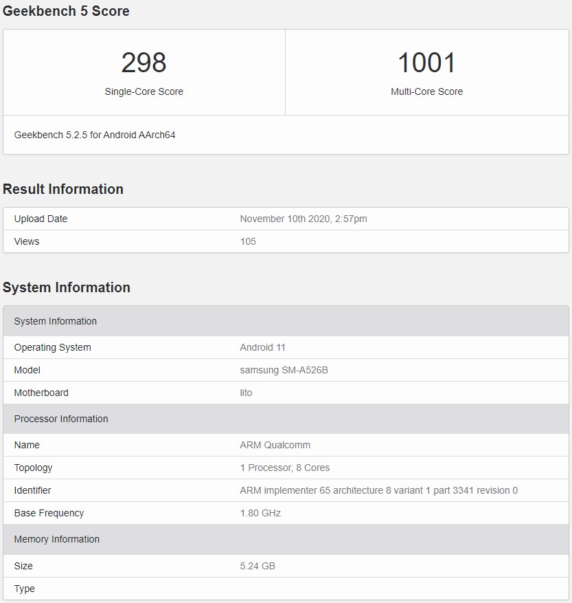 Моделът се появи в GeekBench и изглежда ще използва чипсет Snapdragon 750G в комбинация с 6GB RAM и Android 11. Резултатите му са 298 и 1001 точки съответно в едноядрения и многоядрения тест на Geekbench 5.