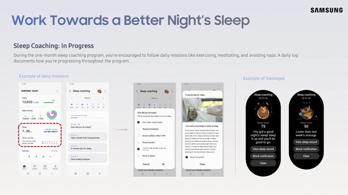 Друга нова добавка е за измерване на сърдечния пулс при възстановяване, която ще дава данни до две минути след края на тренировката. Samsung въвежда и нова програма за подобряване на съня на база на ежедневните дейности. Сред нововъведенията ще видим още автоматична опция за изключване на свързани SmartThings устройства, когато часовникът засече, че спите.