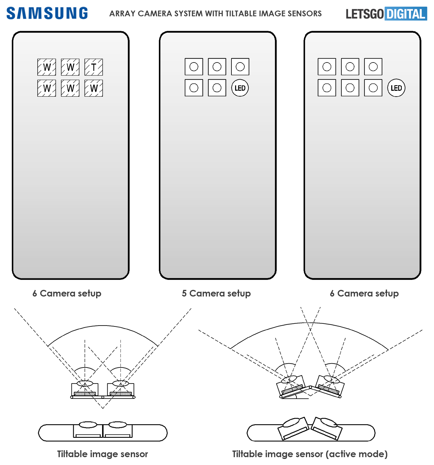 Нов патент на Samsung показва, че компанията работи върху смартфон с шесторна основа камера. Въпросната заявка е подадена миналата година и включва чертежи на телефони с различни комбинации от сензори, включително с шест. Друг интересен момент е, че сензорите ще са подвижни и ще могат да се накланят.