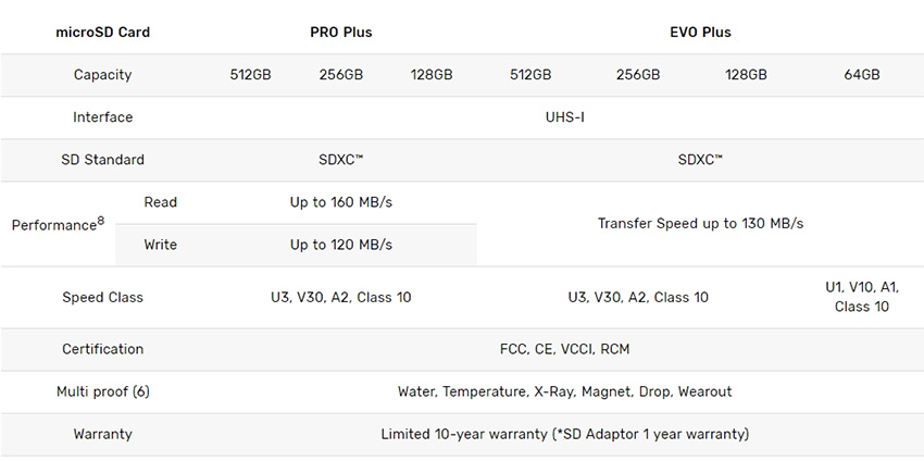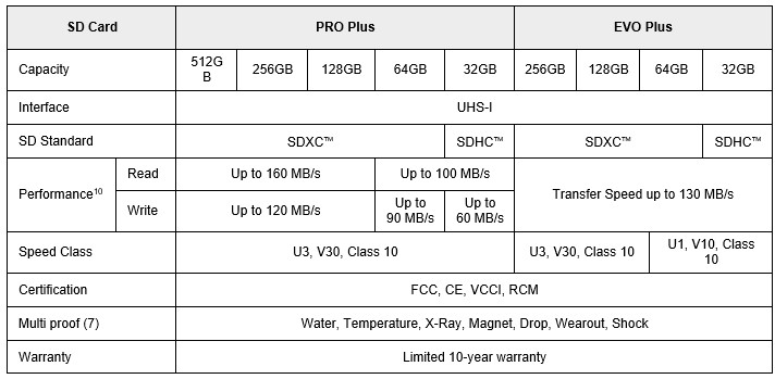 Новата серия PRO Plus е предназначена за създатели на съдържание и осигурява скорости до 160MB/s и 120MB/s съответно при четене и запис на информация. Картите ще са налични с капацитет 128GB, 256GB и 512GB. Моделите EVO Plus са за обикновени потребители и предлагат скорости на трансфер до 130MB/s като осигуряват до 1.3 пъти по-бързо последователно четене спрямо преходната версия. Картите EVO Plus се предлагат с капацитет 64GB, 128GB, 256GB и 512GB.