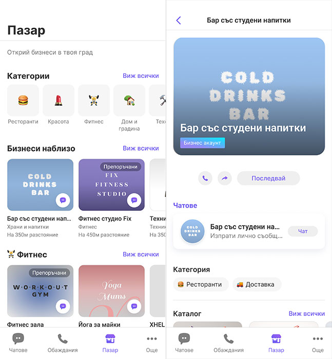 Viber Пазар (Marketplace) заменя секция Акценти (Explore) в приложението и помага на потребителите да откриват локални бизнеси по три удобни начина: чрез персонализирани предложения, чрез търсене на конкретен бизнес или чрез разглеждане на различни бизнес категории. Те могат да разглеждат бизнес акаунти, каталози с продукти или услуги, както и да изпращат съобщения директно до бизнесите, без телефонният им номер да е видим.