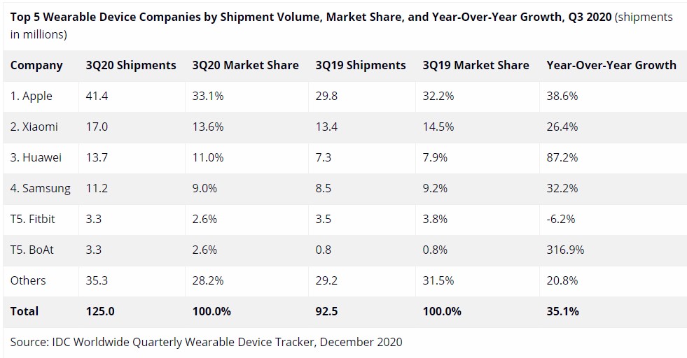 Лидер, и то с голяма преднина, продължава да е Apple. Компанията от Купертино има 41.4 милиона доставки с дял от 33.1% и ръст на годишна база 38.6%. Следват Xiaomi и Huawei със съответно 13.6% и 11%. Челната петица допълват Samsung с 9% и Fitbit и BoAt, които са с по 2.6%.