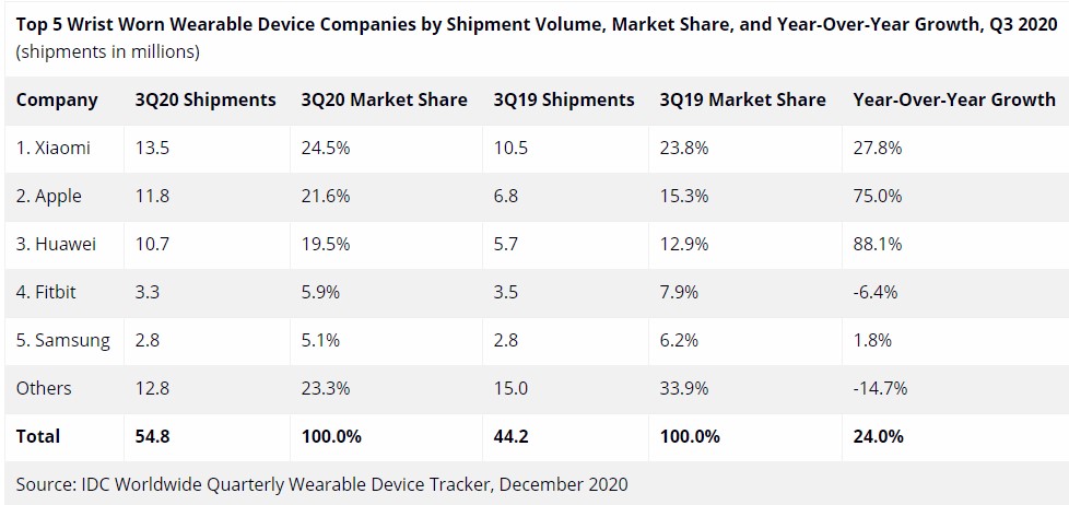 IDC споделя и данни за доставките в сегмента с устройства, които сe носят на ръката, включително фитнес гривни и умни часовници. Тук лидер е Xiaomi с 13.5 милиона доставки, дял 24.5% и ръст 27.8%. Следват Apple и Huawei със съответно 11.8 и 10.7 милиона доставки и дялове от 21.6% и 19.5%.
