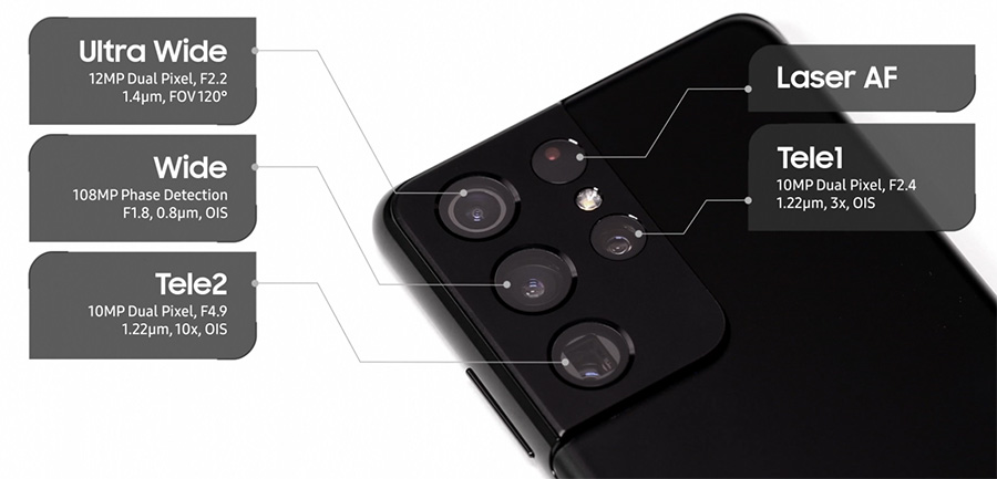 Моделът залага на 108МР (f/1.8) главен сензор с OIS, а до него откриваме още 12МР (f/2.2) с ултраширокоъгълна оптика и автофокус и два 10МР сензора с телефото лещи, Dual Pixel автофокус и OIS. Единият сензор е с бленда f/2.4 и осигурява 3х оптично приближение, а другият е с f/4.9 и предлага приближение от 10х. Компанията посочва, че новия главен сензор осигурява по-широк динамичен диапазон и подобрено цветопредаване.