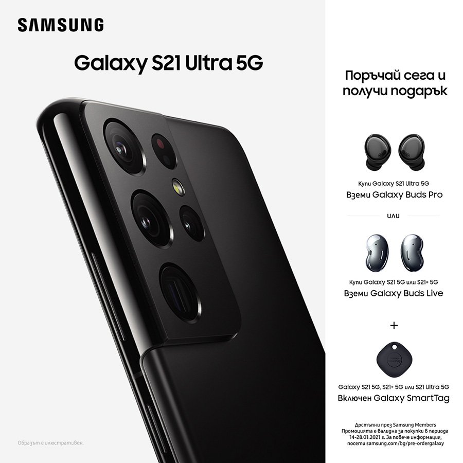 Между 18:20 ч. на 14 януари и 23:59 ч. на 28 януари е налична кампания за предварителни поръчки. Първите 400 участници, активирали своето устройство до 6 февруари и регистрирали своята покупка в периода 03:05 ч. на 22 януари и 23:59 ч. на 28 февруари в приложението Samsung Members ще получат подарък в зависимост от закупения модел. За първите 150 клиенти, регистрирали покупката на Galaxy S21 Ultra, има слушалки Galaxy Buds Pro и Galaxy Smart Tag. За първите 250, регистрирали покупката на Galaxy S21+ или Galaxy S21, са осигурени слушалки Galaxy Buds Live и Galaxy Smart Tag.