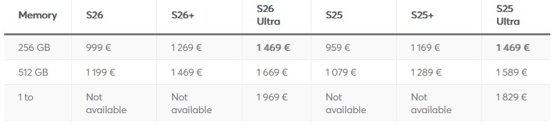 Цената на Galaxy S26 ще започне от 999 евро за 256GB и ще достигне до 1199 евро за 512GB. За същите памети Galaxy S26+ ще се продава съответно за 1269 и 1429 евро – ако това се окаже вярно то версията с повече памет ще поскъпне със 180 евро спрямо миналата година.