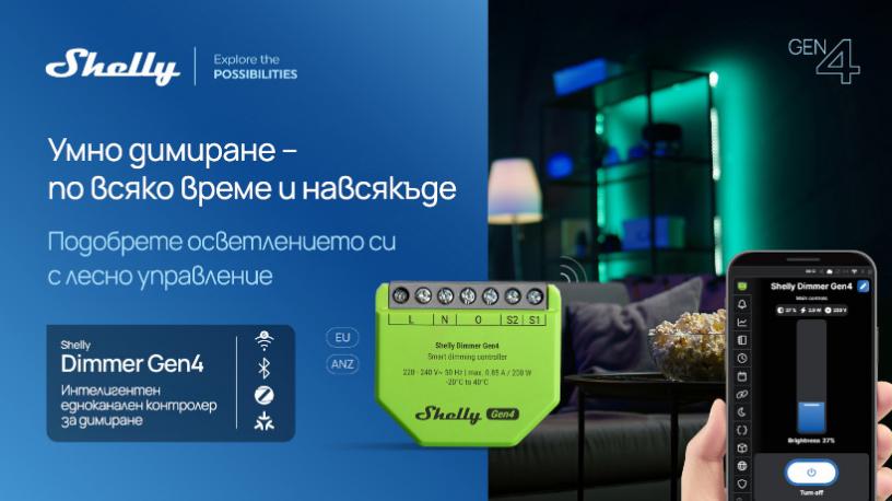 Dimmer Gen4 е обновена версия на димера на Shelly, който поддържа Wi-Fi 6, Bluetooth 5, Zigbee и Matter. Благодарение на това може да се интегрира в широк набор от платформи за умен дом.