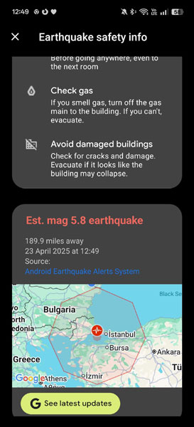 Преди минути в 12:49 местно време беше отчетено земетресение с магнитуд 6.3 по скалата на Рихтер с епицентър в Западна Турция на дълбочина 5 км в Мраморно море и то активира системата в Android за предупреждения при земетресения.