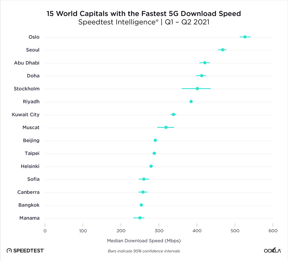 Оказва се, че в топ 15 попада и София, която със средна скорост на изтегляне на данни 260.55 Mbps се намира на 12 място. Първата позиция е за норвежката столица Осло със средна скорост 526.74 Mbps, а втората позиция е за Сеул с 467.84 Mbps. Челната тройка се допълва от Абу Даби със скорост 421.26 Mbps. Прави впечатление, че в топ 15 има само четири европейски столици и една от тях е София.