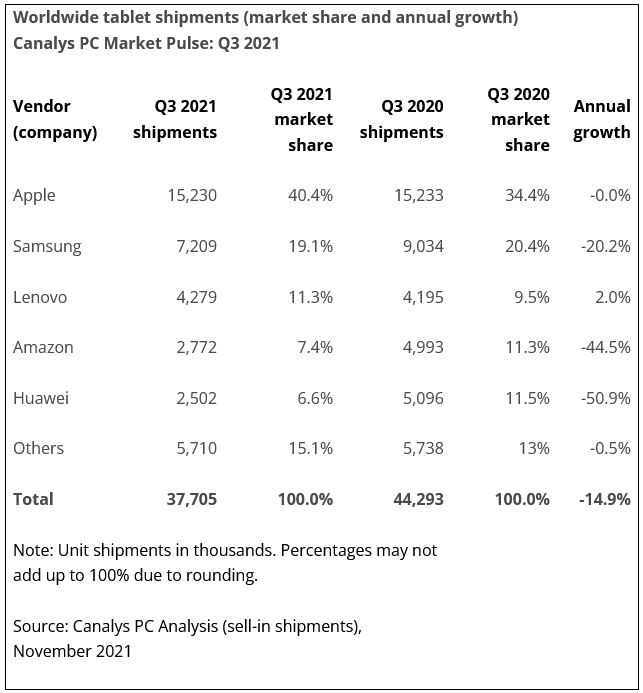 Лидер на пазара продължава да бъде Apple с 15.2 милиона доставки и дял 40.4%. В топ три са още Samsung и Lenovo с доставени съответно 7.2 и 4.3 милиона устройства и дялове 19.1% и 11.3%. Челната петица допълват Amazon (2.8 милиона доставки) и Huawei (2.5 милиона доставки), но те отчитат спад от съответно 44.5% и 50.9%.