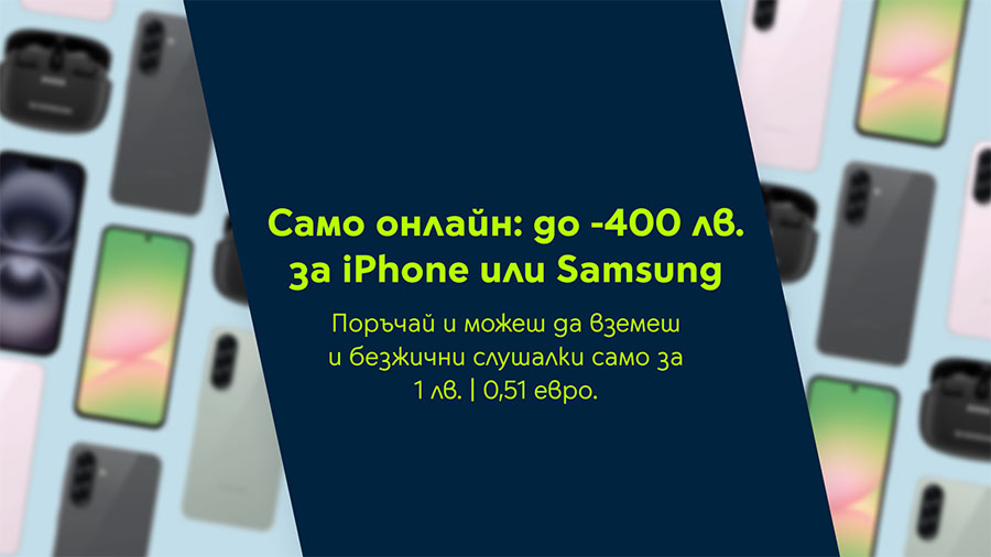 В онлайн каналите два от най-търсените модели смартфони се предлагат със страхотна отстъпка отново до 6 януари 2026 г. Намалението в цената е съответно до 300 лв. за SAMSUNG A56 5G 128GB и до 400 лв. за iPhone 16 128GB при покупка в брой или на лизинг с избрани планове Total Unlimited.