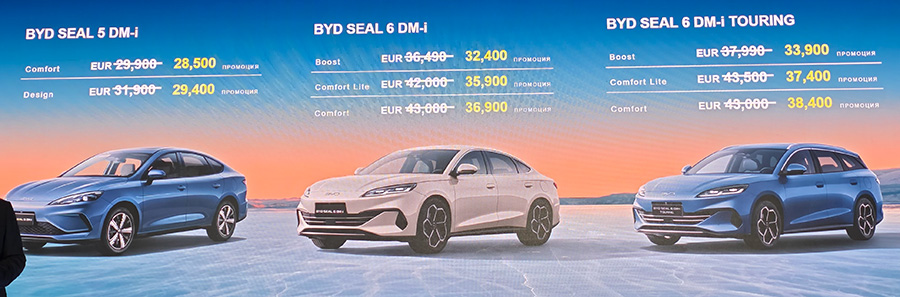 При по-компактните предложения хибридният BYD Seal 5 DM-i ще струва 28 500€ за оборудването Comfort и 29 400€ за ниво Design. Малко по-големият модел Seal 6 DM-i е на цени между 32 400€ и 36 900€. По-големият им "брат" Seal 6 DM-i Touring ще може да се закупи на цени от 33 900€ до 38 400€.