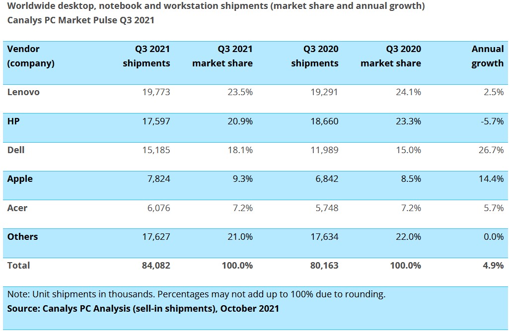 Водач продължава да е Lenovo с 19.77 милиона доставки, дял 23.5% и ръст от 2.5%. Втори са HP със 17.6 милиона доставени компютри, дял 20.9% и спад от 5.7%. Челната петица допълват Dell, Apple и Accer с дял от съответно 18.1%, 9.3% и 7.2%. Най-голям ръст има Dell с цели 26.7%.