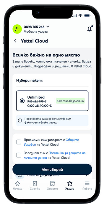 Услугата може да бъде активирана лесно през приложението Yettel или във всеки магазин от търговската мрежа на оператора. Ако клиентът избере да го направи дигитално, първо трябва да отвори последната версия на приложението Yettel, да влезе в меню „Услуги“ – секция „Твоето устройство“ и да избере Yettel Cloud, откъдето да активира желания пакет. След това е необходимо да инсталира новото приложение Yettel Cloud, достъпно за Android и iOS. Като алтернативен вариант, може да избере да достъпи сайта yettelcloud.bg през браузър на компютър или лаптоп. След вход в профила с имейл или телефонен номер и парола, вече може да качва, подрежда и споделя своите файлове, които ще бъдат съхранени и винаги на една ръка разстояние в облака.