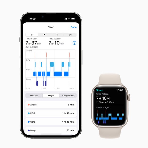 От компанията подобряват функционалността за следене на съня с въвеждането на етапи. Така Apple Watch може да даде разбивка за REM, основен и дълбок сън. watchOS 9 включва и история за AFib за диагностицираните с атриална фибрилация.