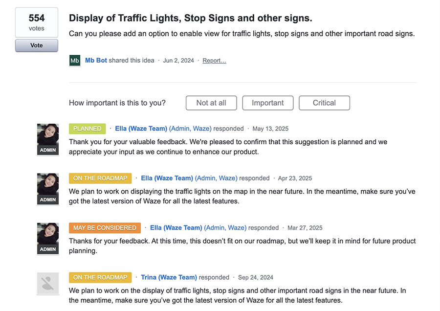 В отговора се споменаваха конкретно „светофари, знаци “Стоп” и други важни пътни знаци“, както беше поискано от потребителя, публикувал идеята. „Планираме да работим по [това]“, заяви Waze. Отговорът беше актуализиран през март 2025 г., когато екипът на Waze явно се отказа от идеята. „В момента това не се вписва в нашия план за действие“, се казваше в актуализирания отговор.