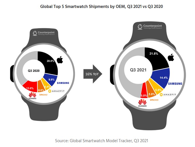 Apple продължава да е лидер, но отстъпва до 21.8% пазарен дял спрямо 28% за същия период на миналата година. Това се отдава на по-късната поява на Apple Watch Series 7. Очаквано Huawei губи позиции и пада до 5% пазарен дял спрямо 13.6% за същото тримесечие на 2020.