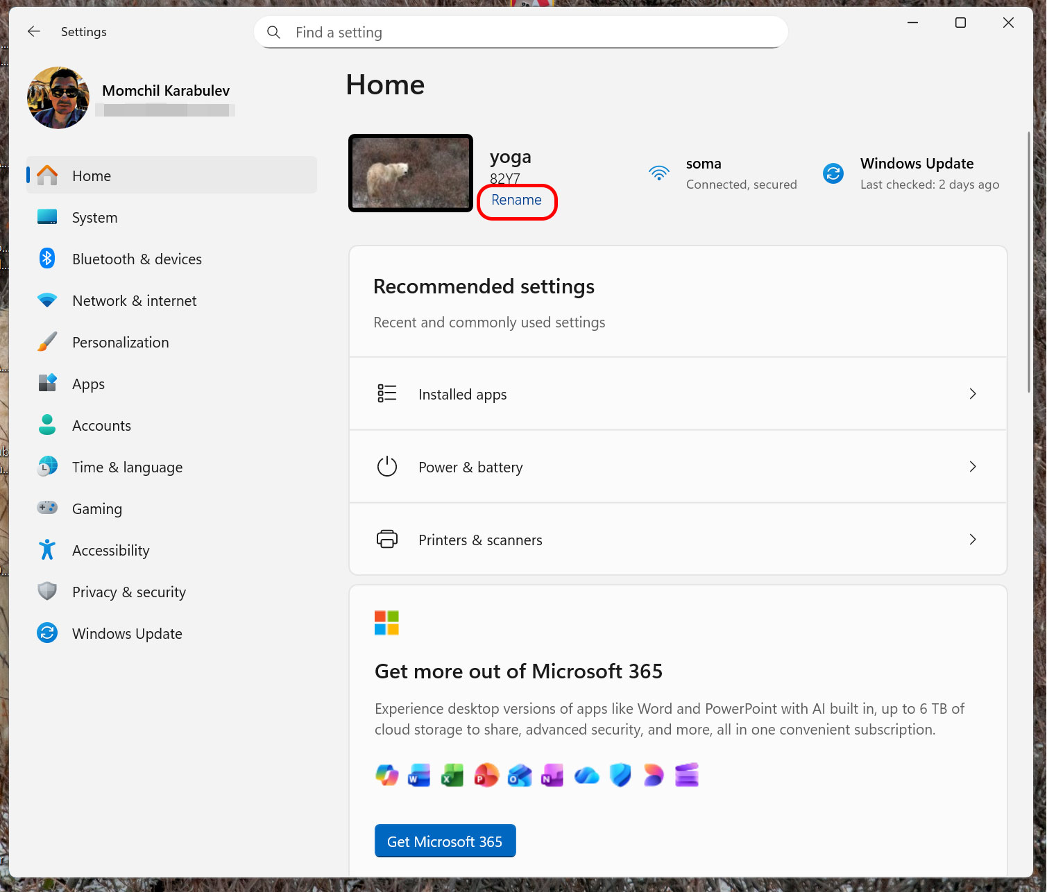 В по-новите версии на Windows 11 можете да достъпите екрана за преименуване на компютъра още по-бързо от главния раздел „Начало“ на приложението „Настройки“. В горната част на екрана има специален раздел, който съдържа набор от основни данни за компютъра, както и бърза връзка за преименуване.