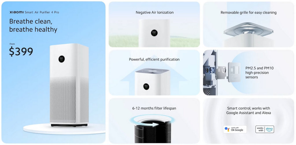 Топ моделът Xiaomi Smart Air Purifier 4 Pro предлага 3-в-1 филтрираща система, която комбинира технологии за механично и електростатично филтриране за улавяне на до 99.97% от замърсителите на въздуха с размер 0.3 микрона. Устройството има подобрени PM2.5 и PM10 лазерни сензори за прецизно определяне на размерите на частиците във въздуха. Добавен е и йонизатор за прихващане на други замърсители. Моделът е висок капацитет и може да пречиства въздуха в помещения с препоръчителна площ 35-60 квадратни метра.
