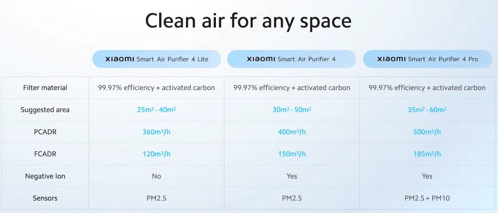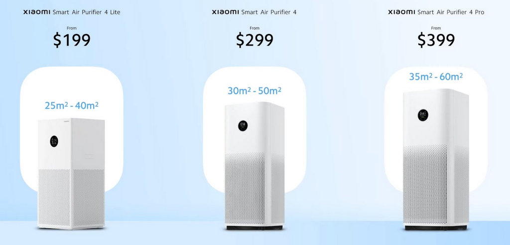 Xiaomi Smart Air Purifier 4 и 4 Lite са с по-малък капацитет и се препоръчват за по-малки помещения, но и двата модела са с ефикасност 99.97% и включват филтър с активен въглен и PM2.5 сензор. Smart Air Purifier 4 има и йонизатор, какъвто липсва в базовия модел. Устройствата ще се предлагат на препоръчителни цени съответно 399, 299 и 199 долара.