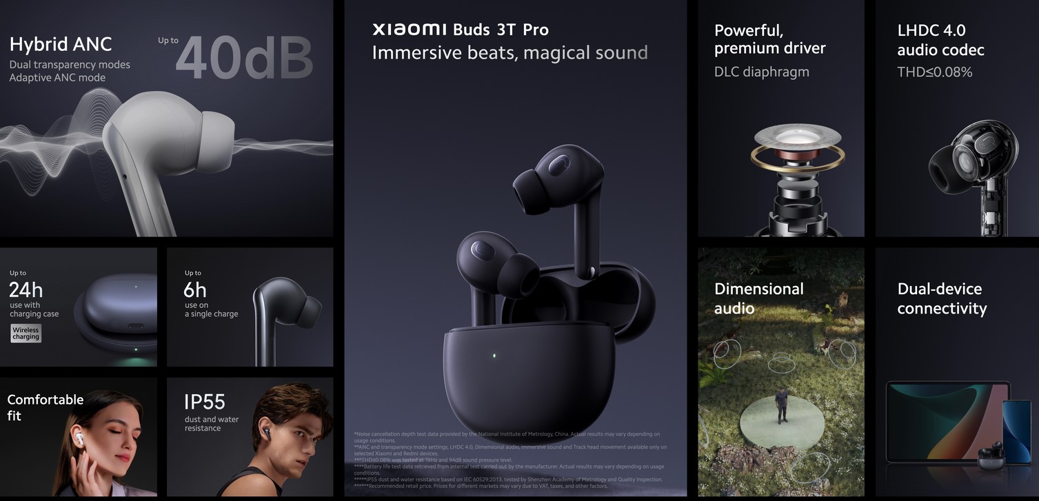 Xiaomi Buds 3T Pro се предлагат в бял и черен цвят и включва технология за активно шумопотискане в три режима с адаптивна опция в зависимост от околната среда. Постига се хибриден ефект на шумопотискане до 40 децибела. Слушалките имат и два режима за пропускане на звука.