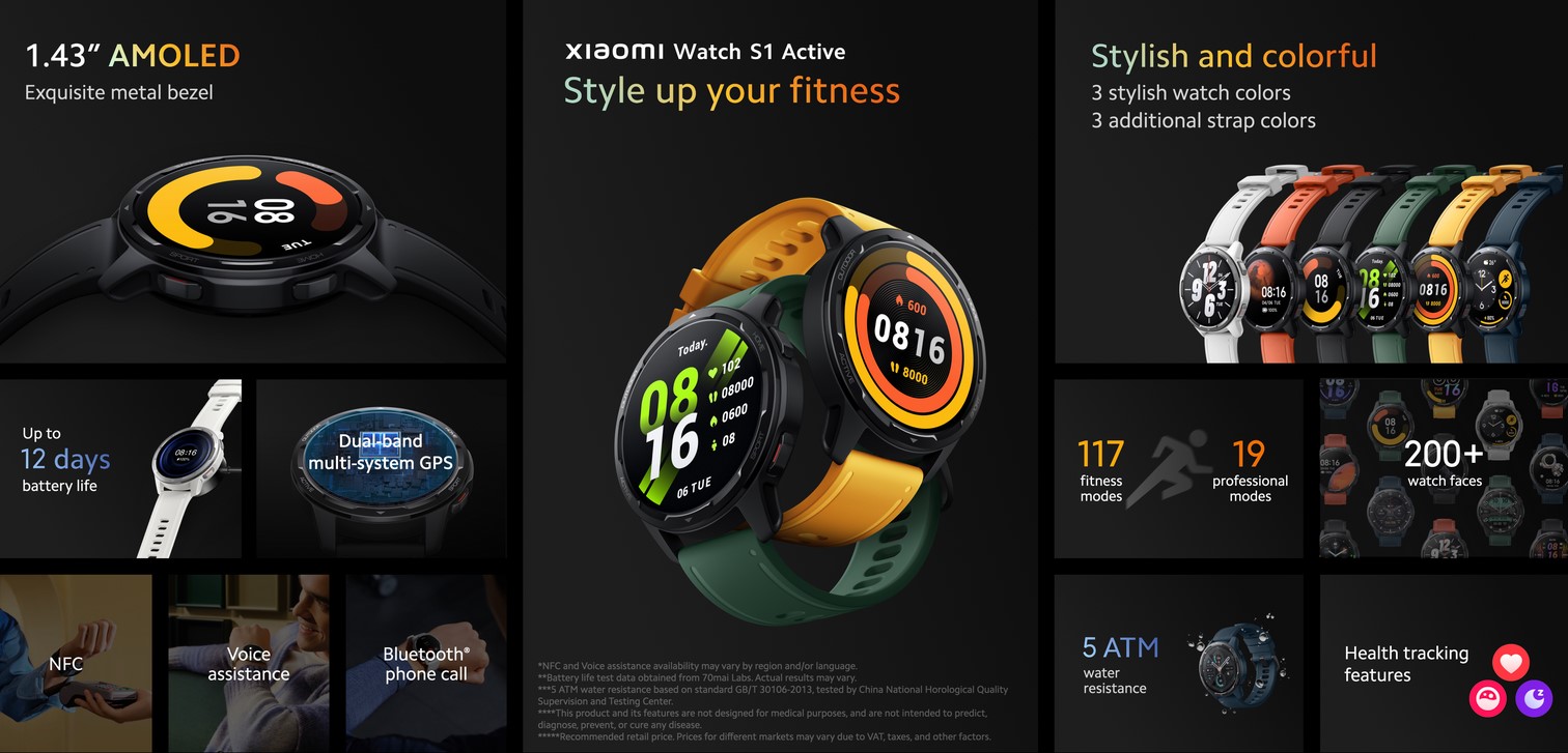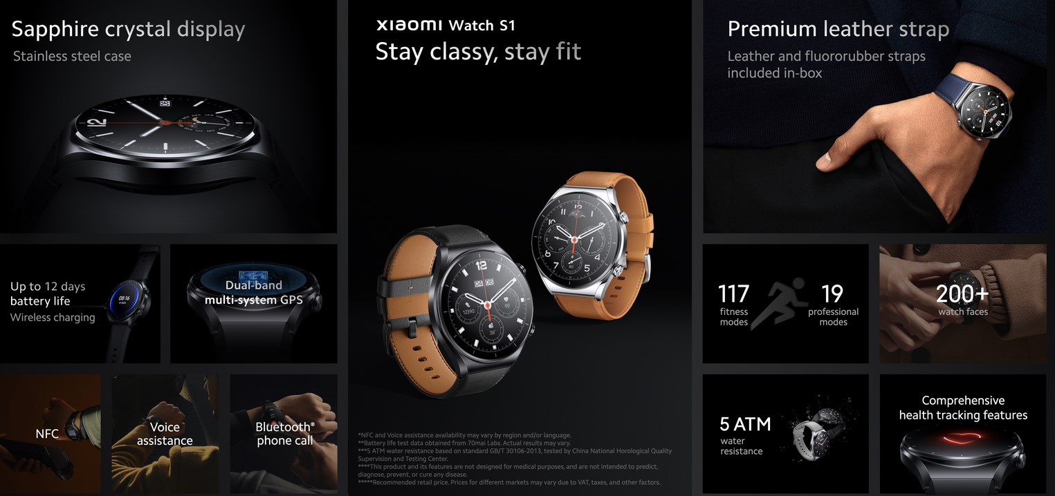 Серията умни часовници Watch S1 включва едноименния модел и Watch S1 Active. Xiaomi Watch S1 има рамка от неръждаема стомана и 1.43-инчов AMOLED екран с покритие от сапфирен кристал. При по-спортния S1 Active е използвана лека метална рамка без сапфирено покритие.