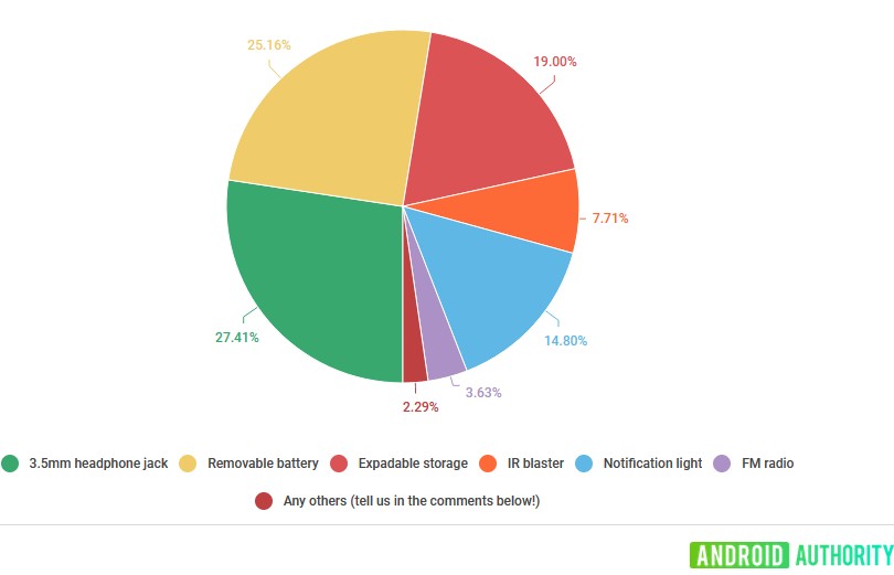 Макар че няма ясен победител в анкетата, резултатите показват, че почти равен брой хора искат две ключови функции. 3.5-милиметровия жак за слушалки и лесно заменяемата батерия са начело в резултатите, като получават съответно около 27% и 25% от гласовете.