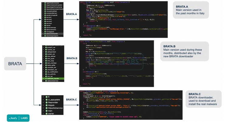 Разработени са различни варианти на зловредното решение за таргетиране на множество региони, включително Обединеното кралство, Полша, Испания, Италия, Китай и Южна Америка. BRATA.A, който е преобладаващият вариант, има възможността за проследява GPS-а на смартфоните на жертвите и да ги ресетва.