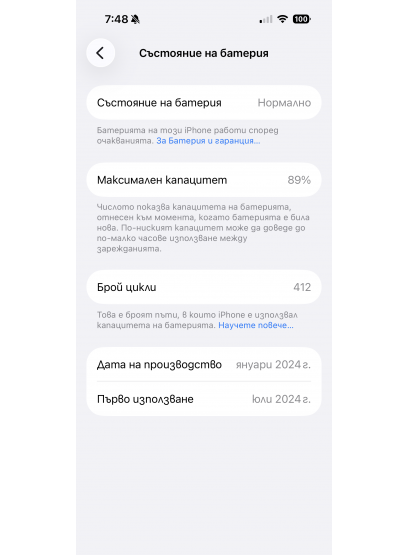 Продавам iPhone 15 Pro 128GB Natural. Телефона е в перфектно състояние ,капацитета на батерията е 82%/ броя на циклите е 1027. Нямам интерес от бартери и цената в обяват е крайна - 501,07 EUR