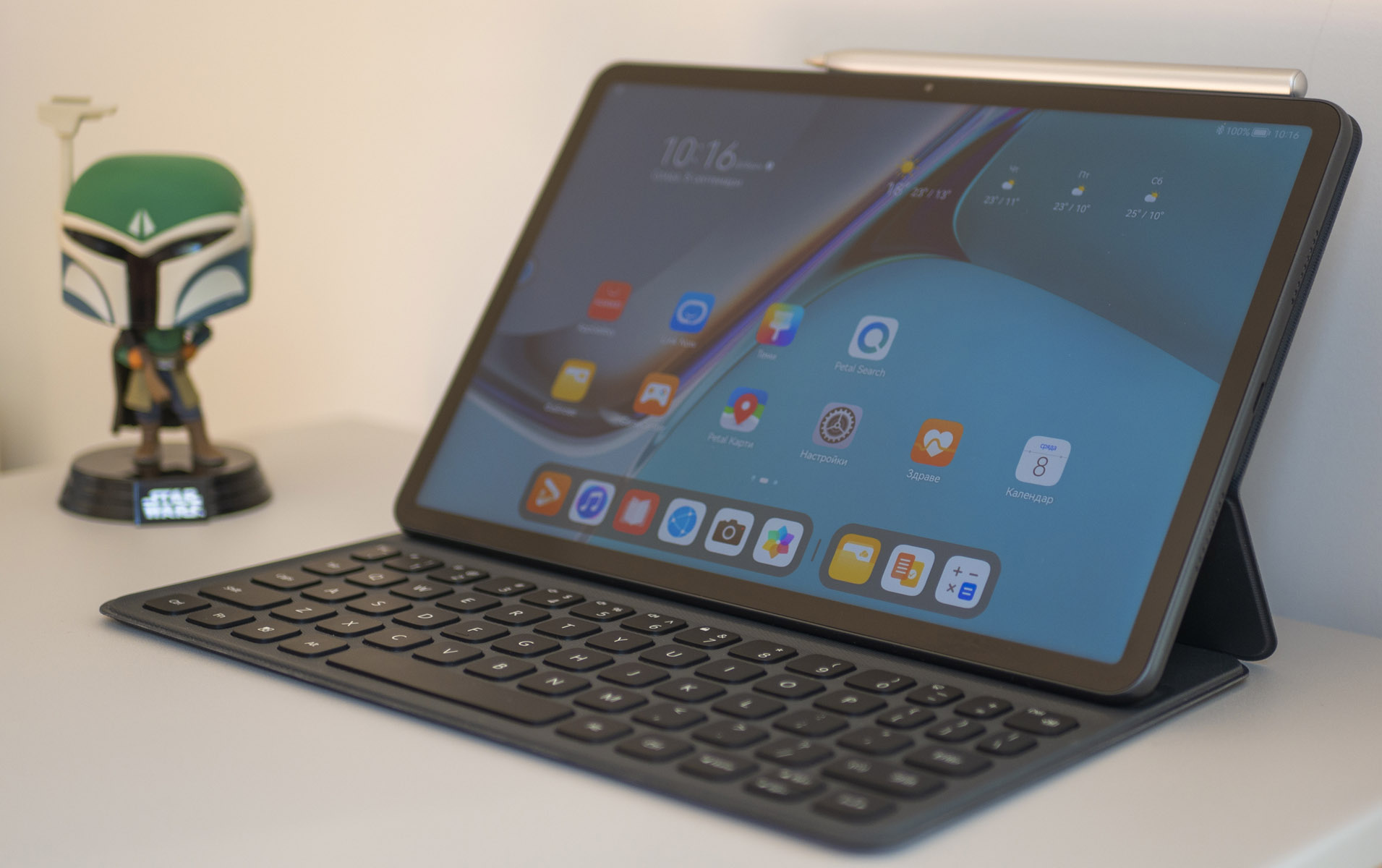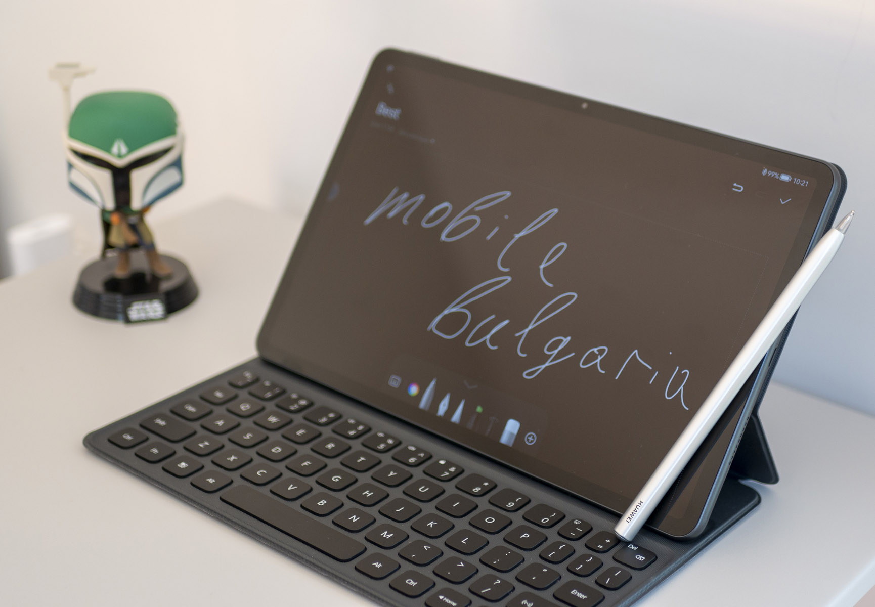 Huawei MatePad 11 идва в комплект с калъф с клавиатура и стилус M-Pencil (2-ро поколение). Клавиатурата се прикрепя магнитно и защитава дисплея на таблета, а връзката става през Bluetooth. Магнитното фиксиране е достатъчно силно за безпроблемна и спокойна работа и със сигурност няма как да я откачите без да искате.