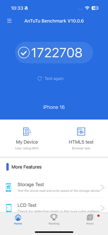 Стрес тестовете на свой ред показват стабилност от около 60%, което е сравнимо с iPhone 15, но Apple твърди, че е подобрила вътрешния дизайн за по-добро разсейване на топлината. Това е от значение за продължителни гейминг сесии, при които производителността ще остане висока за по-дълъг период от време. Както може да се предположи, няма никакви проблеми с бързината на устройството в ежедневието, но както споменах и по-рано, липсва плавността, която осигуряват моделите Pro и техните 120-херцови дисплеи.
