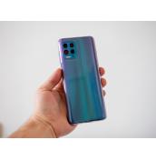 Отзад g100 е наистина бляскав, защото гърбът му прелива между лилаво, зеленикаво и синьо според отблясъците на околната светлина. Това изглежда забележително и ми допадна за разлика от ползваната пластмаса, която определено не оставя премиум усещане. Четворната камера е в горния ляв ъгъл и изпъква съвсем леко.