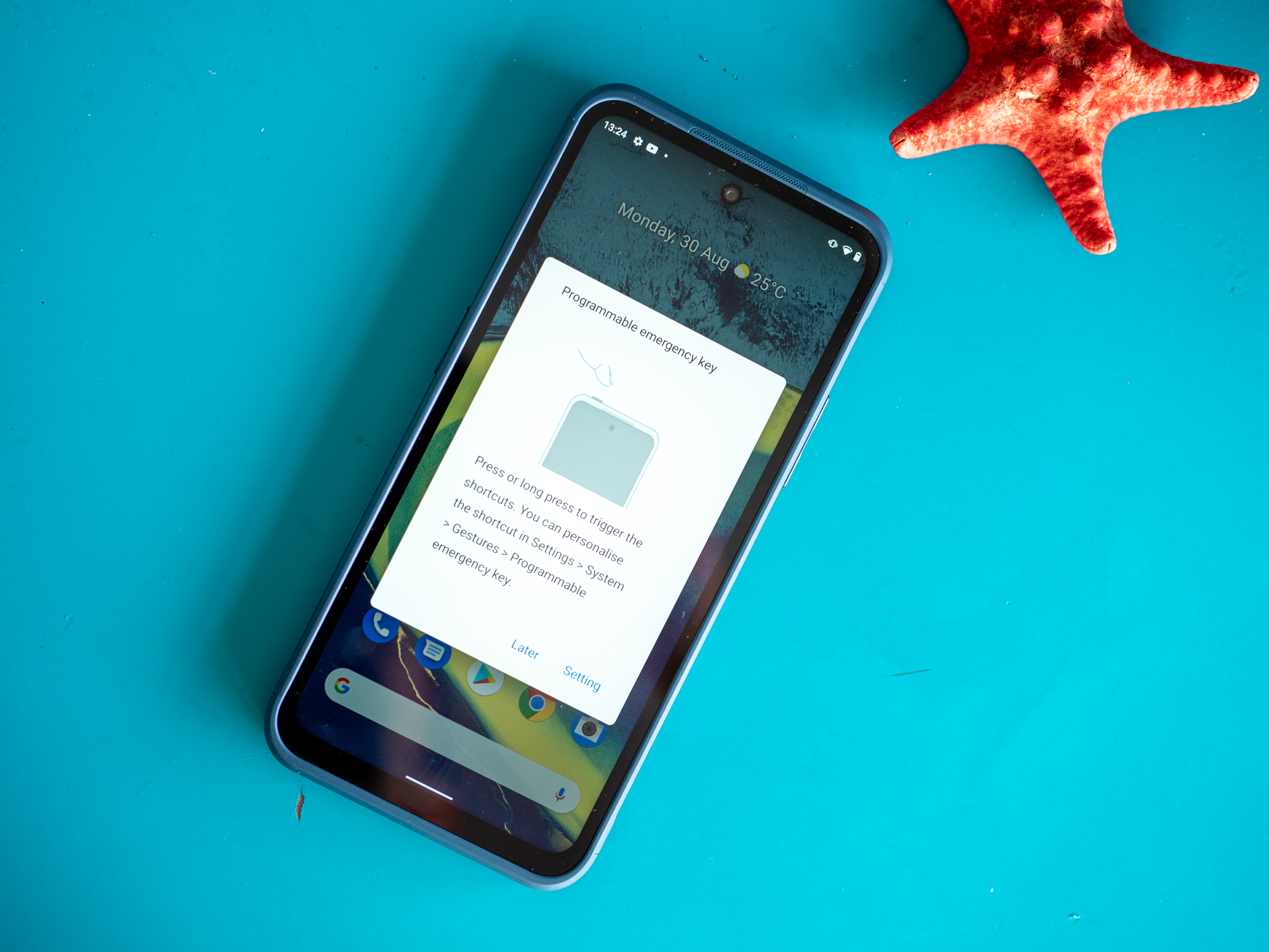 Едно от нещата, които правят впечатление в XR20, са множеството физически бутони. Вдясно са тези за звука, които са тактилни и лесни за натискане, за разлика от копчето за заключване, което е плитко, натиска се трудно и не се усеща лесно. Отгоре е бутон, който се нарича Emergency Button и може да се програмира да изпълнява различни функции при натискане и задържане. До него е гнездото за две SIM карти, като единият слот може да се използва за карта с памет. Вляво е бутон за Google Assistant, който не е програмируем и може просто да е включен или изключен. Отдолу са говорителят, жакът за слушалки и USB-C входът, както и място, на което можете да закачите връзка за носене.