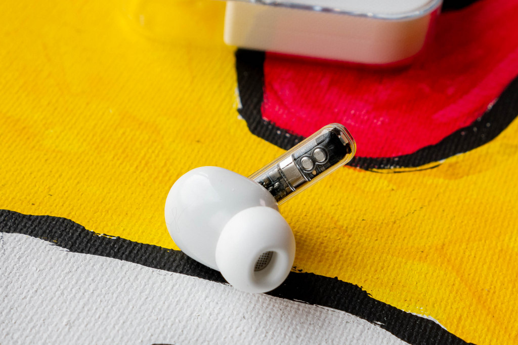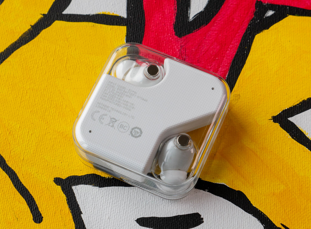 Върху външната страна се виждат два микрофона и сензорната зона за управление плюс бяла или червена точка, които указват позицията на всяка слушалка - червена за дясно и бяла за ляво. От страната към бузата се забелязват компоненти, магнит за фиксиране в кутийката и двата конектора за зареждане. Слушалките се предлагат в бял и черен вариант, което е класическа селекция и може би повече от достатъчен избор за първия продукт на стартираща компания.