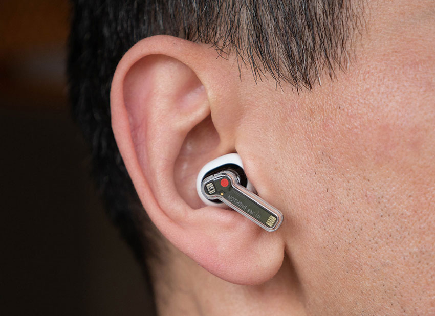 Останалата част на слушалките е покрита с непрозрачна пластмаса, така че погледът към компонентите се изчерпва само с тези от стеблото. Така или иначе при носене овалната част попада в ушната мида, което означава, че няма какво да се види от нея. При черното издание тази част е напълно черна, но при бялото е двуцветна (бяло и черно). Като цяло нищо радикално, макар че първите споделени от Nothing концептуални изображения показаха слушалки с неконвенционална форма. В търговския комплект, който има ефектна опаковка, влизат силиконови уплътнения в три размера и USB-C кабел за зареждане.