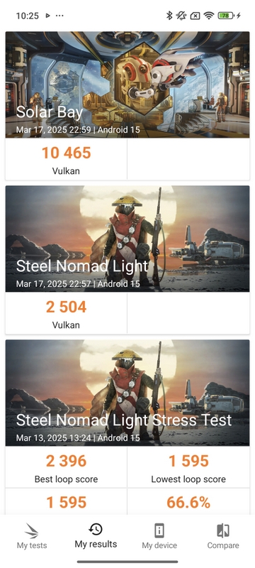 Чипсетът Dimensity 7300 Ultra е от средния клас, а тестовете потвърждават това – представянето е очаквано, без да впечатлява, но достатъчно за плавна работа дори при натоварване. В стрес тестове Redmi Note 14 Pro 5G запазва почти пълната си производителност, което говори за стабилност.