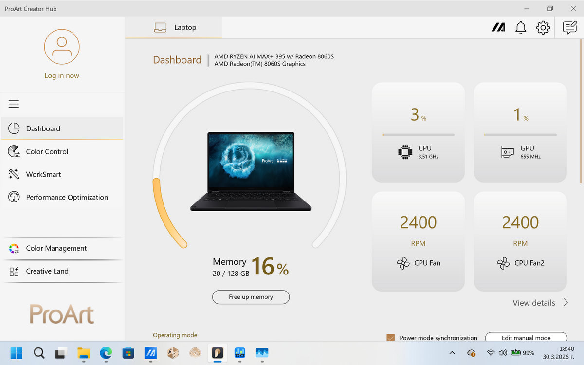 Устройството идва с цели 128 GB обединена LPDDR5X RAM памет, която е запоена директно към дънната платка и се споделя между процесора и графичния ускорител. Както споменах, предвид днешните цени на паметите, това количество несъмнено допринася за високата цена на лаптопа. Устройството поддържа автоматично преразпределяне на тази памет, така че можете да заделите до 96 GB само за графичния ускорител.