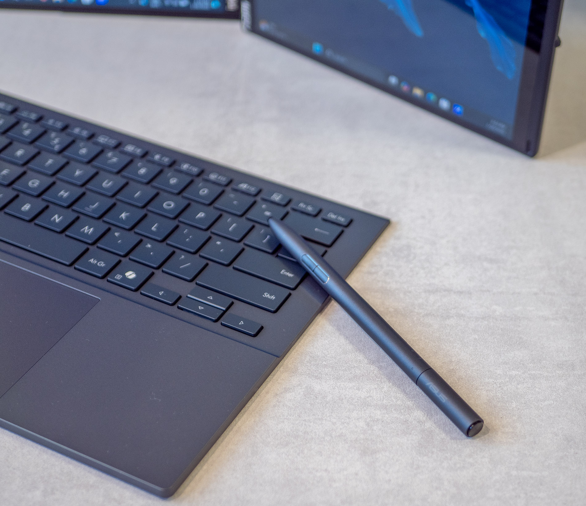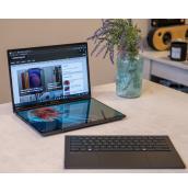 Zenbook Duo идва в комплект с лесно прикрепяща се Bluetooth клавиатура, която е обширна и с адекватен ход на клавишите, както и с подсветка. Тъчпадът е с голяма площ. Клавиатурата може да се сложи върху долния екран, като се прикрепя магнитно, а и така се зарежда. Можете също така да я поставите в близост до лаптопа и да я използвате отделно.