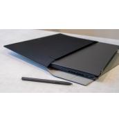 Zenbook Duo е с практичен и много функционален дизайн. Той идва в тъмносиво (Inkwell Gray), като на капака има няколко линии, придаващи естетична визия. В отворено състояние отличаваме два големи екрана със сравнително тънки странични рамки.