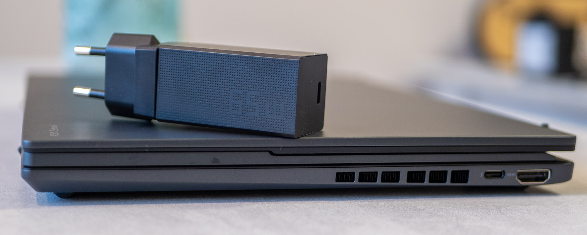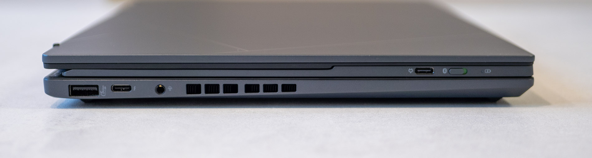 Наличен е адекватен набор от портове. От двете страни са разположени общо 1 x USB Type-A, 2 х USB Type-C, HDMI и 3.5 мм комбиниран жак за слушалки и микрофон. Конструкцията е с дебелина 14.6 мм и тегло 1.35 кг.